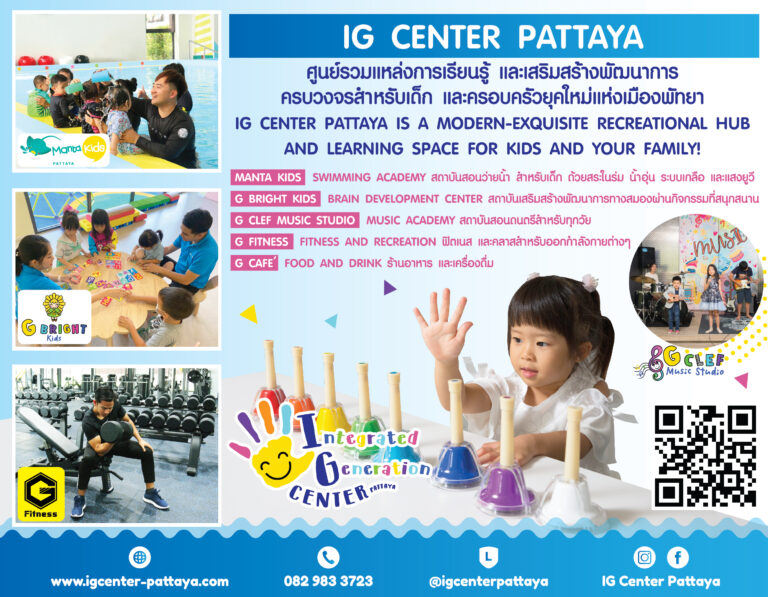 ศูนย์รวมสถาบันการเรียนรู้ และเสริมสร้างพัฒนาการ IG CENTER PATTAYA Tel : 082-9833723 Facebook : IG Center Pattaya Website : www.igcenter-pattaya.com Location : IG CENTER PATTAYA
