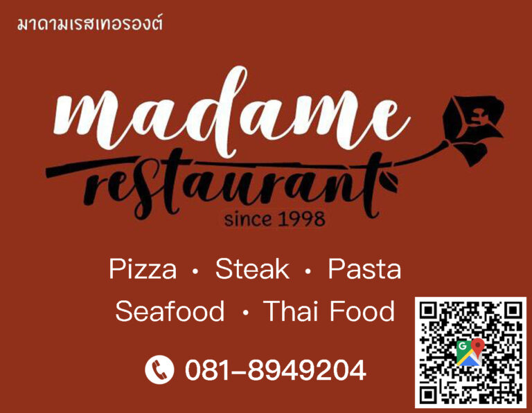 มาดาม เรสโตร Madame Resto Tel: 081-8949204 Facebook : Madame Resto >>Location Madame Resto<< พิช่า เสต็กjพาสต้า,ชีฟู้ด,ไทยฟู้ด Pizza , Steak , Pasta Seafood Thai Food
