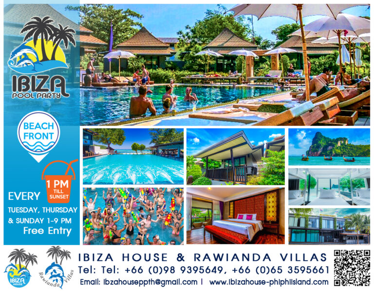 ไอบิซ่า เอ้าส์ Ibiza House & Rawianda Villas Tel: 098 9395649, 065 3595661 www.ibizahouse-phiphiisland.com Facebook : Ibiza House & Rawianda Villas >>Location Ibiza House & Rawianda Villas<< Email: ibzahouseppth@gmail.com EVERY TUESDAY, THURSDAY & SUNDAY 1-9 PM IBIZA HOUSE & RAWIANDA VILLAS
